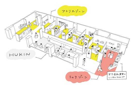 店内は簡易な間仕切り壁等で区割りしたアトリエゾーンと、他の出店者と空間やそれぞれのリソースを共有できるようなシェアゾーンで構成し、入口付近には当社が管理するシェアショップを常設する予定です。