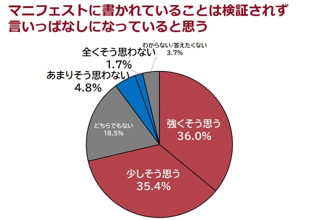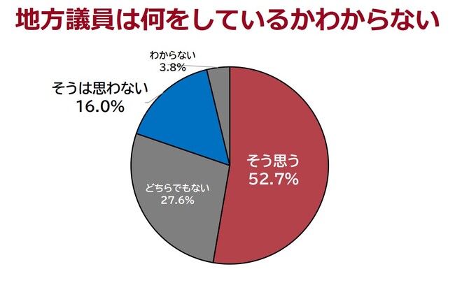 「地方議員は何をしているか分からない」52.7%/「選挙運動用ビラの政策で当落が決まる方が望ましい」55.0%/「マニフェストは検証されず言いっぱなしだと思う」71.4%
