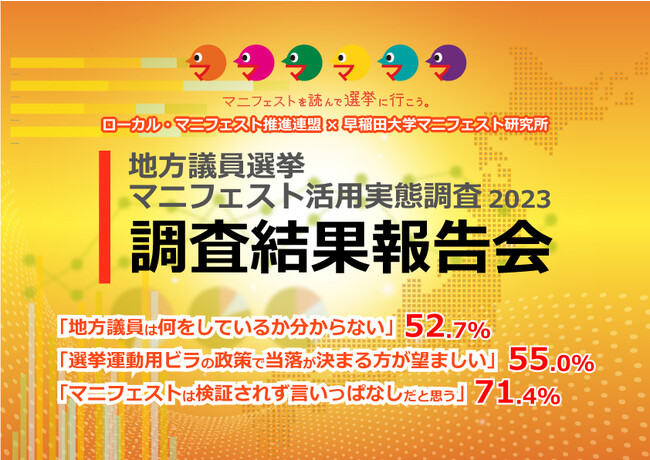全国の超党派の地方議員等で構成するローカル・マニフェスト推進連盟および早稲田大学マニフェスト研究所は、今春の統一地方選挙を前に、選挙運動用ビラやマニフェストに対する有権者の意識、活用状況等を調べるインターネット調査(回答数1,332)を実施しました。2023年3月9日(木)に、本調査結果の報告会ならびに本件に関する記者会見を開催しますので、下記の通りご案内申し上げます。