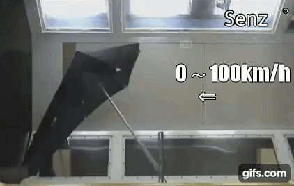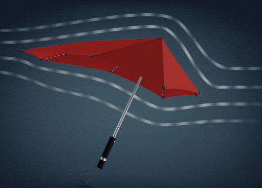 空気力学に着目した結果、傘は前方が短く後ろが長いという形状となり、それは強風を翼のように受け流すことを証明しました。長柄のSenz゜Original(別タイプ)は時速100km/h以上の暴風にも耐えられます。