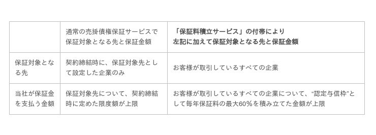 通常の売掛債権保証サービスでは、当社が保証をしていない先が貸し倒れた場合、当社はお客様へ保証金をお支払いできませんが、「保証料積立サービス」を付帯したご契約の場合には、保証をしていない先が貸し倒れた場合でも、“認定与信枠”として積み立てた金額を上限に、当社はお客様へ保証金をお支払いいたします。“認定与信枠”は最大3年間積み立てることが可能です。