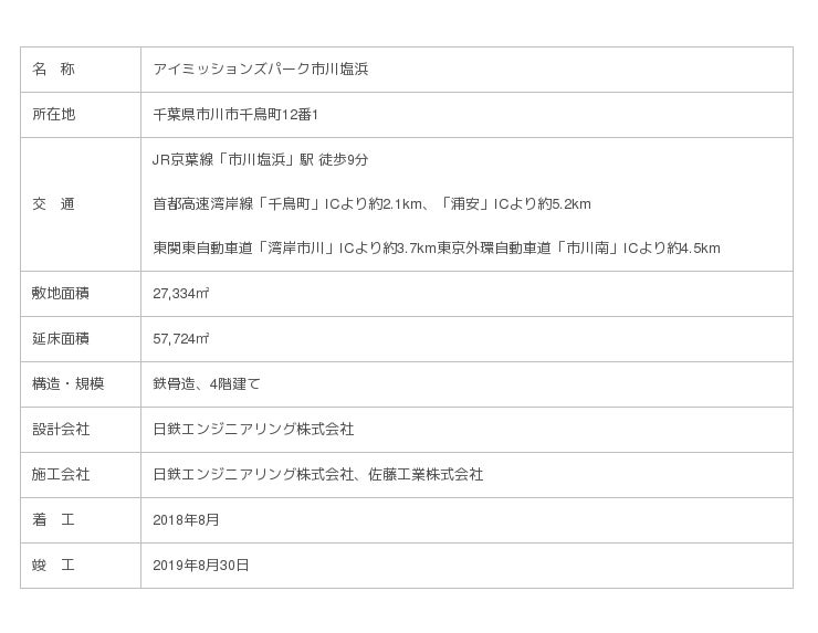 伊藤忠都市開発株式会社(本社:東京都港区、代表取締役社長:松典男)は、伊藤忠商事株式会社(本社:東京都港区、代表取締役社長:鈴木善久)と共同で開発を進めてきたマルチテナント型物流センター「アイミッションズパーク市川塩浜(千葉県市川市)」が、8月30日に竣工を迎えましたのでお知らせいたします。