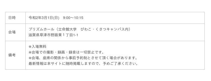 令和2年2月29日(土)・3月1日(日) 立命館大学びわこ・くさつキャンパスにて開催。