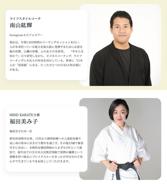 ゲストトークイベントでは、ライフスタイルコーチ・南山紘輝氏や、極真空手全日本大会無差別級で昨年優勝を果たした福田美み子氏を迎え、「自分ど真ん中」で盛り上がって生きる方法や応援される人の特質について語っていただきます。