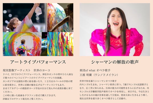 オープニングでは、現実創造アーティスト・世界のヨーコ氏と、平和へのメッセージを届けるシャーマンオペラ歌手・王渡明蘭(ワンノドメイラン)氏によるライブパフォーマンスが披露されます。