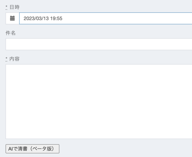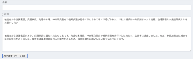 使い方は簡単です。firmee内のメモ作成フォームで元となるメモを作成し、「AIで清書」ボタンをクリックするだけで、報告書風の文章が生成されます。