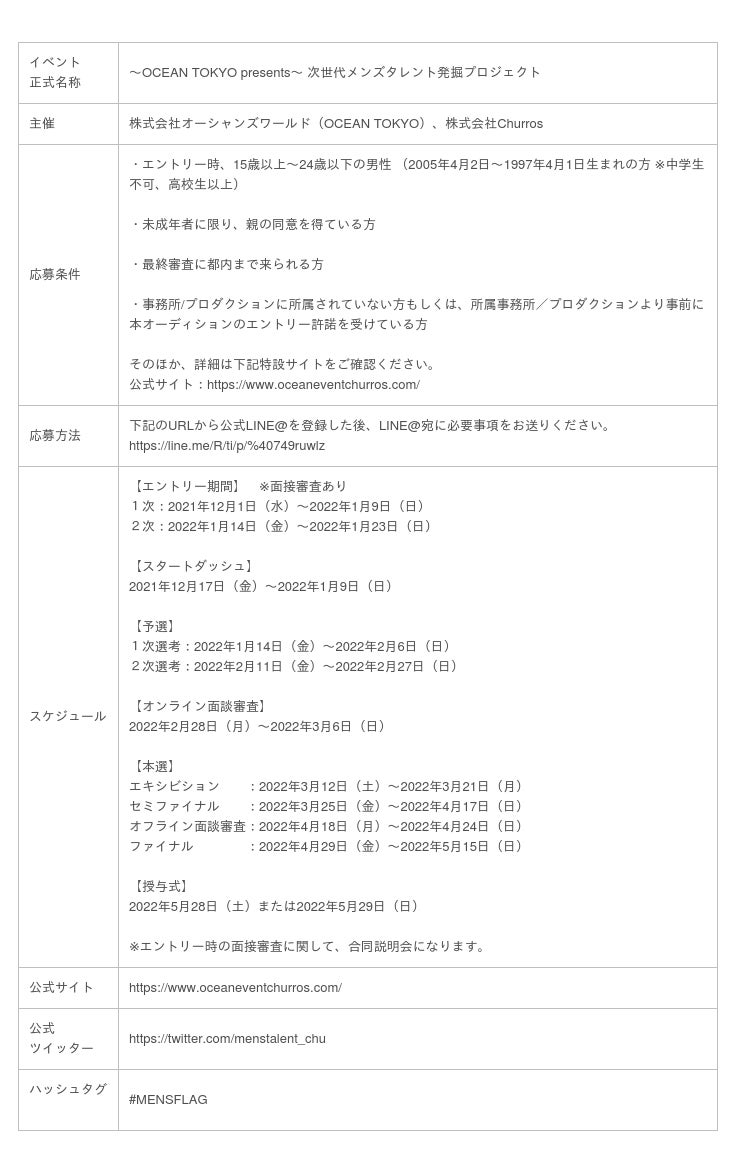 株式会社Churros(東京都渋谷区、代表取締役:斉藤伸樹)は、美容室「OCEAN TOKYO」を運営する株式会社オーシャンズワールド(東京都渋谷区、代表者:高木琢也・三科光平)との合同企画として、国内最大規模のメンズオーディション『~OCEAN TOKYO presents~ 次世代メンズタレント発掘プロジェクト』を開催いたします。現在、本オーディションへのエントリーを受付中です【応募期限:2022年1月23日(日)23:59】。