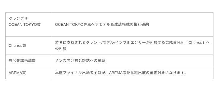 なおファイナル出場者は全員、ABEMA恋愛番組出演の審査対象となることが決定。また、グランプリを含む受賞者には、OCEAN TOKYO専属モデルや、芸能事務所「Churros」への所属をはじめ、有名雑誌への掲載権が確約されるなど、受賞と同時にメンズタレントとして有名になるチャンスを多数ご用意しています。