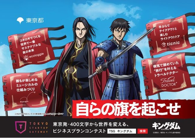 動画では、「TOKYO STARTUP GATEWAY」の内容や過去のコンテストのアイデアをご紹介します。また、最後に登場するセリフは“自らの旗を起こせ”以外に、「キングダム」の名言を用いたセリフを数パターンご用意しています。どのようなセリフが登場するのか、お楽しみください。