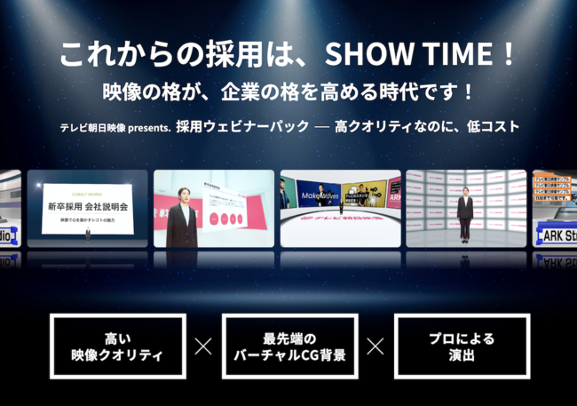テレビ番組をはじめとした映像制作を手掛けるテレビ朝日映像株式会社(本社:東京都港区、以下「当社」)は企業向けに、オンライン採用説明会などの企画・撮影・編集・配信までをワンストップで手がける「採用ウェビナーパック」(URL:https://ark.tv-asahipro.co.jp/saiyo-webinar/)をリリースいたしました。