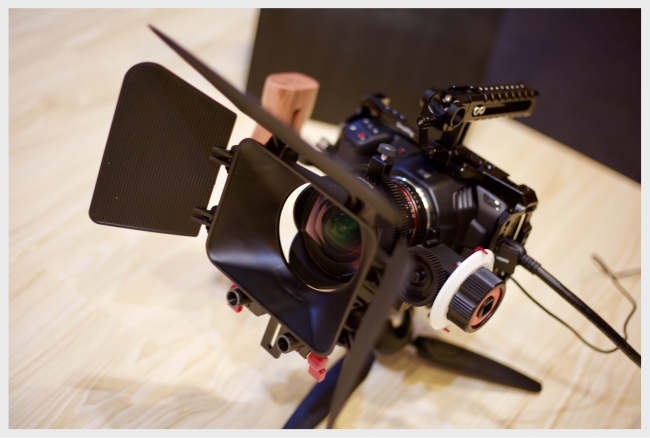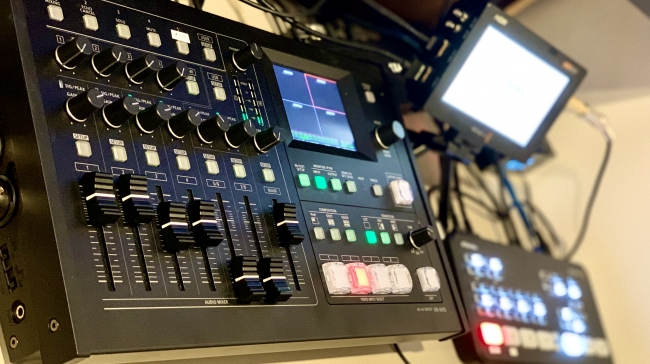 4台のシネマカメラ、スイッチャー、ピンマイク、照明、カフェ風のセット。