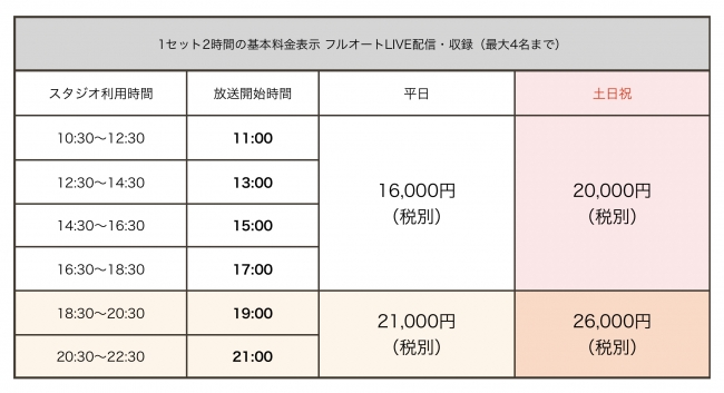 1枠2時間制で1万6,000円~機材込みの価格でご自由に作品を作ることができます。さらに、現在弊社のSNSに広報素材として利用(画像の利用、映像の編集)をご承認いただける場合、上記料金から50%OFF8,000円~の料金でご利用いただけます。