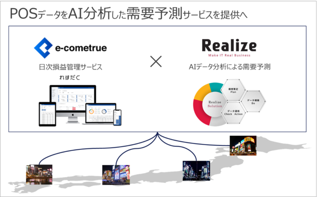 NTTデータグループである株式会社リアライズ(本社:東京都江東区 代表取締役社長:大西浩史 以下、リアライズ)は、飲食店POSデータを分析し需要予測等を提供するクラウドサービスを2022年夏に提供を開始します。飲食店向け日次損益管理サービス「れすだく」を手掛ける株式会社イー・カムトゥルー(本社:札幌市中央区 代表取締役社長:上田正巳 以下、イーカム)と業務提携し、ビッグデータを活用した飲食店支援ビジネスに参入します。