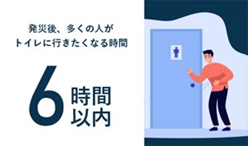 災害備蓄で多くの方が思い浮かべるのは水や食料ですが、盲点の一つがトイレ問題と言えます。災害時、食事は多少我慢ができても、一般的な成人で平均5回前後行くといわれる“トイレ”は、誰にも我慢できません。内閣府の報告によると、発災後6時間以内に約7割の人がトイレに行きたくなるといいます。