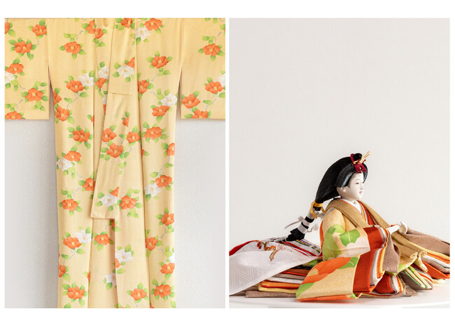 お雛さまに使われている生地は、ヴィンテージ着物を再利用しています。時を経た着物が、新たな美しさを放つ「世界にたった1つのお雛さま」です。