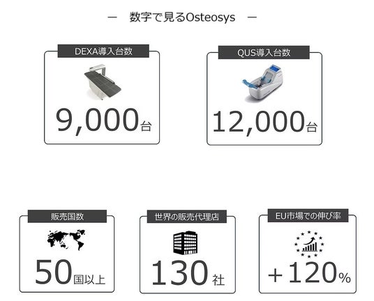 50か国以上での販売実績があり、全世界での骨密度測定装置導入台数は20,000台を超え、販売台数は伸び続け、特にEU市場では市場伸び率が120%を記録しています。