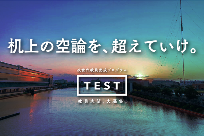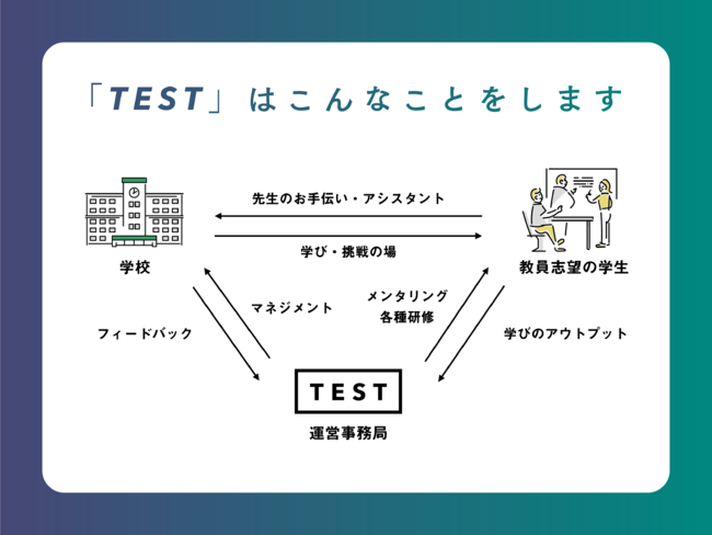 まず、次世代教員養成「TEST」は、日本初の学校へのインターンとして、ボランティアよりもさらに教育実習生よりも質の高い教育家人材を輩出する、次世代教員養成プログラムです。このプロジェクトでは「学校に関わる教員、学生、子どもが幸せな社会をつくること」を目標に、私たちは、教育に携わるすべての人と活動しています。