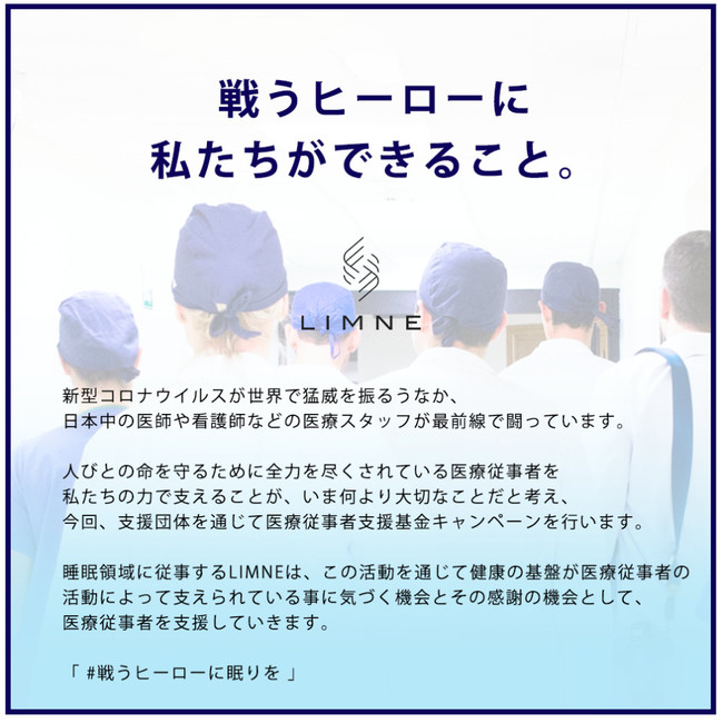 そこで、睡眠領域に従事している私たちLIMNEは、「戦うヒーローに眠り」を提供すべく、支援団体を通じて、Instagramによる医療従事者支援基金キャンペーンを行います。