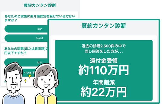 公的支出、特に税金、社会保険料、医療費、介護費などは、知らずに払い過ぎてしまうケースが多く見受けられます。「賢約カンタン診断」は、これらの支出を簡単な質問に答えるだけでチェックし、どれくらい無駄な支出があるか、またその削減額や還付金額を予測します。サービスの利用により、将来の生活破綻リスクを減らし、支出を適正化するサポートを提供いたします。