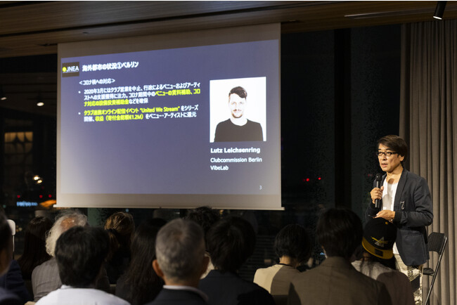 会の冒頭では、JNEA代表理事齋藤貴弘がナイトタイム活性化に向けたJNEAの活動報告を行い、「都市にとって夜は非常に重要」というアムステルダム市長の言葉を引用しながら、「夜」に文化的な価値を見出すことを提案。パンデミックが去った今、改めて官民一体となってナイトタイムエコノミーの推進体制を整え、政策化していくことが必要と訴えました。