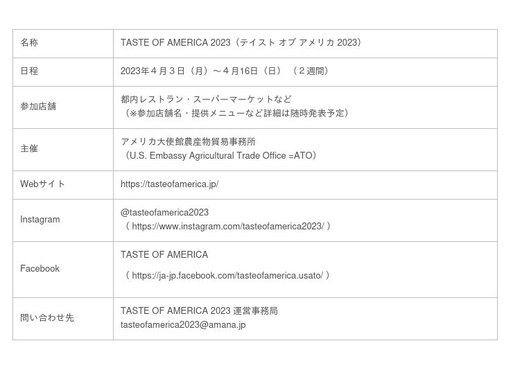 アメリカ大使館農産物貿易事務所より依頼を受けTASTE OF AMERICA 2023開催のため、株式会社アマナが運営する組織です。