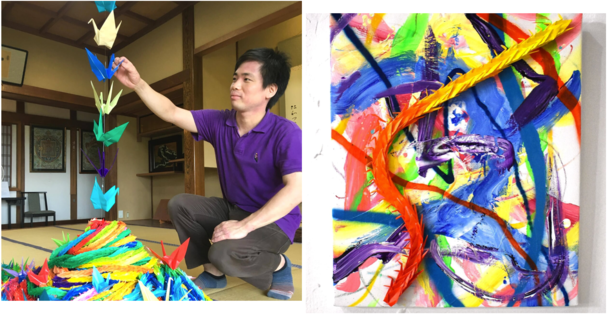国内外から故郷の広島へ届けられる千羽鶴やその焼却灰を使用した絵画やインスタレーションなどを制作し、国内外で発表している。作品を通して、広島の記憶を未来へ伝え、平和のシンボルと なった折り鶴(千羽鶴)に「生と死」や「破壊と再生」などの解釈を加え、制作を試みている。