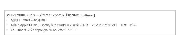 この度、発達障害を乗り越え、子供達の未来に才能を開花させるためのプロジェクト「CHIKI プロジェクト」(運営:株式会社yound)が発足し、渋谷のど真ん中で育った幼馴染の大親友チーパンとキノーによる小学生HIPHOPユニット「CHIKI CHIKI」がデビューいたします。プロデューサーには数々のヒット曲を手がけてきたXLIIを迎え、ファーストデジタルシングル『2DOME no Jinsei』を配信いたします。