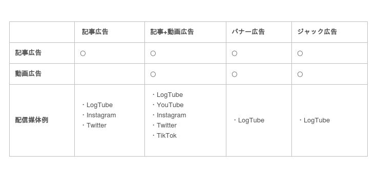 「LogTube」には4種類の広告プランがあります。プロモーション課題にあわせて選択できます。