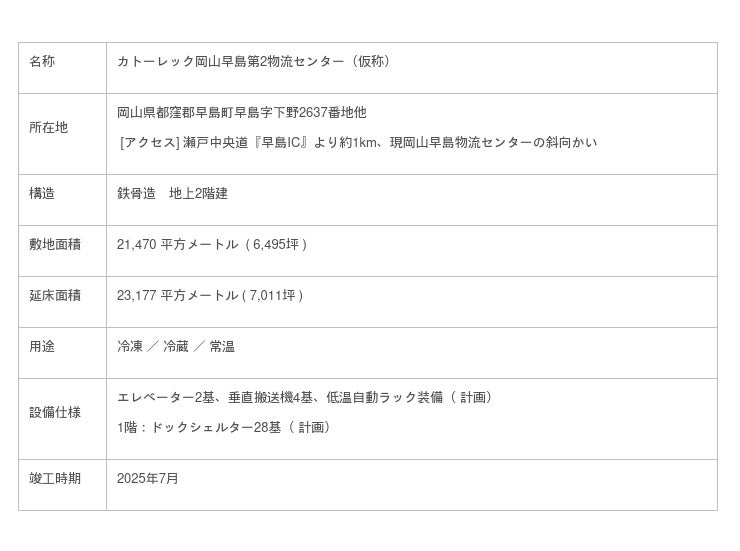 カトーレック株式会社は岡山県早島において、早島第2物流センターの建設を決定しました。