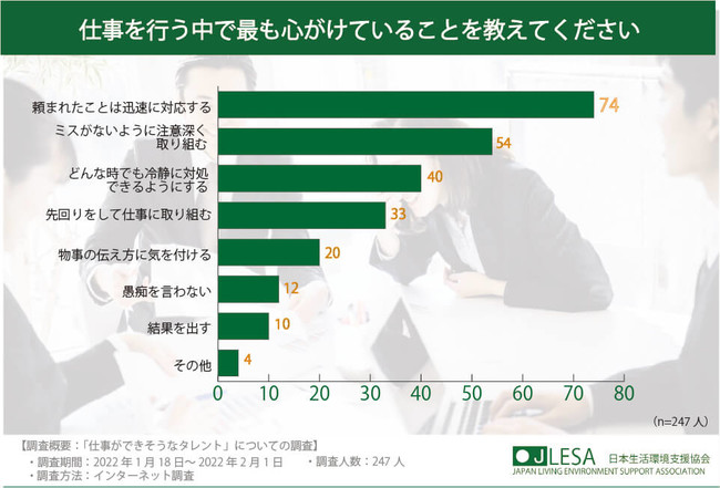 ・「たくさんの仕事を頼まれた時でも、優先順位をつけ、順番になるべく迅速に対応するようにしている。」20代女性/会社員)