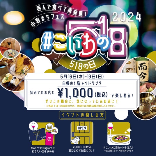 一般社団法人小岩駅周辺地区エリアマネジメント(KOITTO)は、小岩駅周辺地区の再開発に伴う一体的なまちづくりを目指し、JR小岩駅周辺の飲食店41店舗が協力するイベント「#こいわの日(518の日)」を開催します。期間は2024年5月16日(木)から19日(日)までの4日間です。昨年発足した本イベントは、今年は規模を拡大し、プロボノメンバーで構成される実行委員会が主体となって推進しています。参加店舗では、1,000円で店舗自慢の一品とドリンク一杯をセットにしたメニューを提供。本イベントを通じて、小岩エリアの魅力を再発見し、地域コミュニティの活性化に貢献することを目指します。
