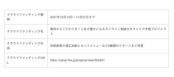 株式会社fanfare(本社:大阪府大阪市、代表取締役:岡本陽子)は、CAMPFIREにてビジネスパーソンを対象とした、働く人生を豊かにするオンライン相談付きキャリア手帳2022のクラウドファンディングを、本日より開始いたします。