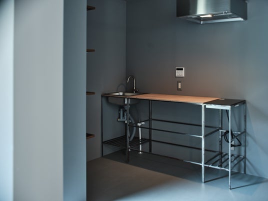 造作のキッチン。カウンターとコンロ部分は可動式なので、使用用途によってレイアウトの変更も可能