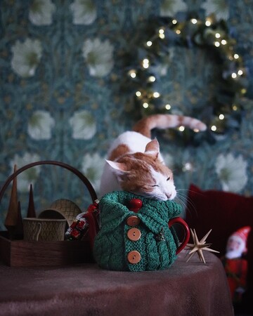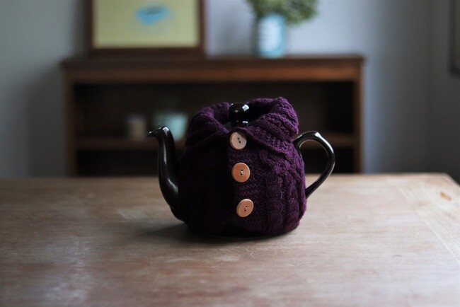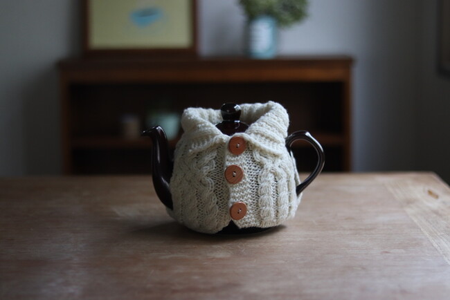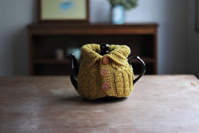 素朴でぬくもりあるティーコージー。まるでポットがカーディガンを着ているようなデザイン。