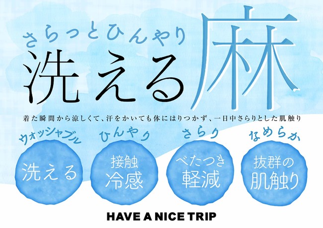 「ハヴァナイストリップ」が提案する洗える麻素材は、天然の麻100%の糸をカットソーで編みたて、バイオ加工・シルケット加工・シルクプロテイン加工を施し、麻特有のチクチクする・シワになるというデメリットを軽減。独自の製法による、さらっとひんやりの着心地で、発売以来累計100万枚を超えるロングセラー素材。豊富なカラーとアイテムのバリエーションを取り揃えており、お気に入りのスタイルを見つけることができる。
