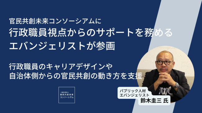 この度、現役行政職員かつパブリック人材であり、その重要性を深く理解しておられる鈴木圭三氏をエバンジェリストに迎えることで、パブリック人材支援や官民共創活動をより推進して参ります。