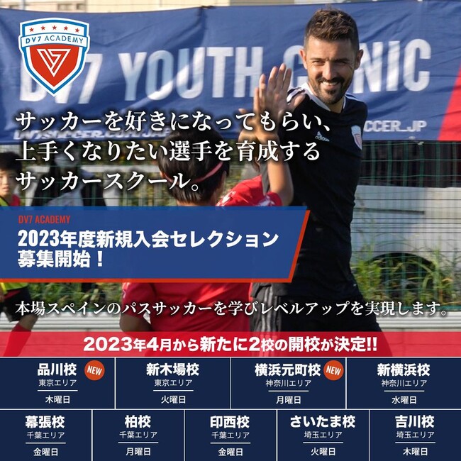 ダビド ビジャ DV7サッカーアカデミーを運営するDV7ジャパン株式会社は、関東にて展開している全9校の2023年度の新規入会生を対象としたセレクションを2月に実施致します。