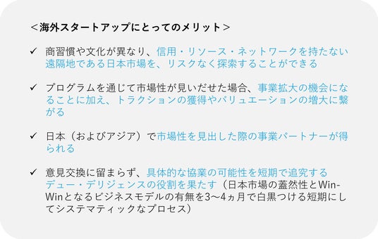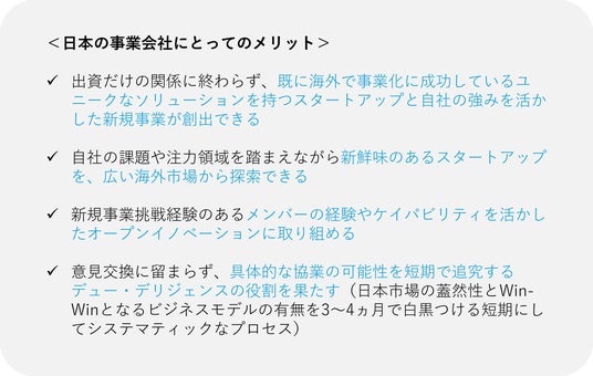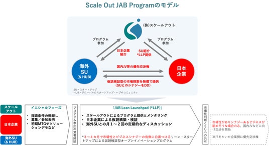 (株)スケールアウトは、リーン・スタートアップの考え方に基づいた新規事業開発の助言や伴走を多数の企業に提供してきました。実践的・構造的なアプローチは暗黙知とされがちな新規事業開発のプロセスを可視化し、透明性と再現性をもたらすことで企業にとって再現性の高い新規事業制度を設計し運営をサポートしてきました。この実績とネットワークを活かし、日本市場への参入を希望する海外スタートアップと日本企業の共創を促進します。また、リーン・スタートアップの実践に習熟した日本側のプロフェッショナルがビジネスモデルの仮説の構築と検証を行うことで、海外スタートアップの市場開拓と共創の可能性を追求していきます。さらに(株)スケールアウトは、日本発グローバル志向のスタートアップに対する投資も行っており、日本企業と海外スタートアップの共創支援に留まらず、グローバルパートナーと協働して日本のスタートアップの海外展開を支援して参ります。