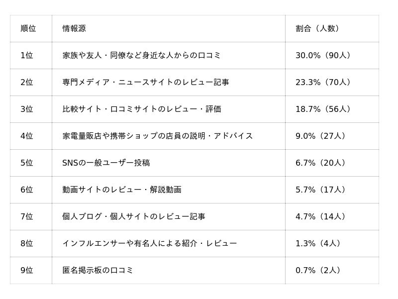 最も頼りにされるのは、「家族や友人・同僚など身近な人からの口コミ(30.0%)」で、次いで「専門メディア・ニュースサイトのレビュー記事(23.3%)」「比較サイト・口コミサイトのレビュー・評価(18.7%)」が続きました。