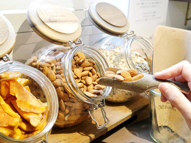 ゼロ・ウェイストの取り組みとして、バルクショップブースでナッツやオートミール、季節のフルーツなどの量り売りを実施。