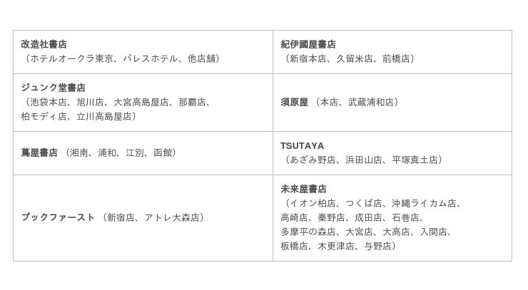 取り扱い書店の一部(50音順)につき、下表をご確認ください。