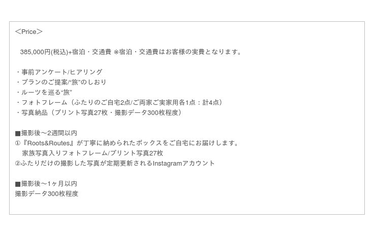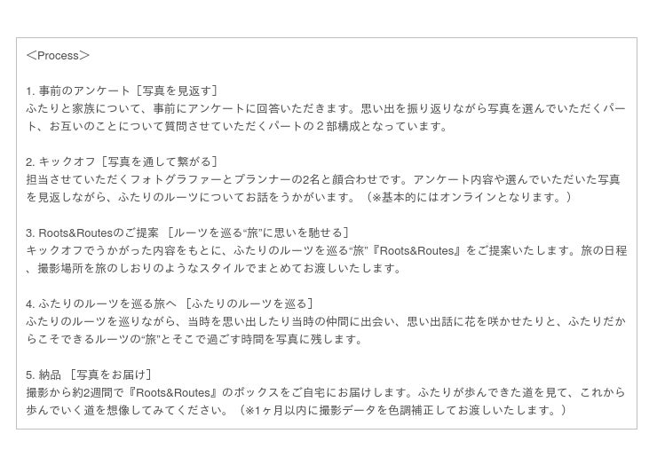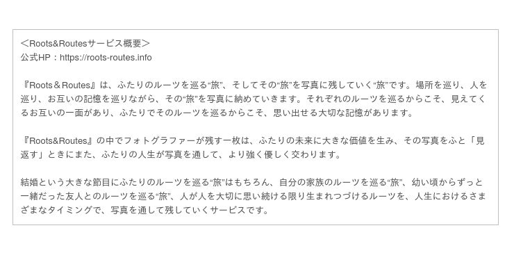 そこに必要なのは、ふたりの歩んだ軌跡とそこで出会った大切な人だけです。ふたりのルーツを巡るこの“旅”自体が、ふたりにとって、家族にとって、ふたりの大切な人にとって「価値ある時間」となることを願い、写真を見返すことで未来への活力が生まれるような体験を『Roots&Routes』は残しつづけます。
