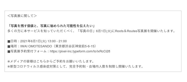 アニバーサリーフォト事業、クリエイティブ制作(写真・映像・デザイン)&プロデュース事業を展開する、株式会社PIXEL(本社:東京都渋谷区、代表取締役:小澤 彩聖(おざわ あやと)、以下PIXEL)は、2021年5月31日(月)、フォトウェディングの需要が高まり結婚式の形式も多様化している現代において、「大切な人と残す写真」という切り口から節目の体験を彩る新サービス『Roots&Routes(ルーツアンドルーツ)』をリリースいたします。