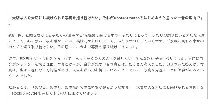 約5年間、多くのカップルを見届け、かけがえのない瞬間を写真に納めてきたフォトグラファーの目線から、「従来の様式にとらわれず、ふたりや家族の絆を深めるための新しい選択肢は他にないか。」「結婚式や結婚の節目を記念するイベントに正解はない時代だからこそ、本当にふたりにとって価値あるモノや時間とは何か。」を考えつづけ、行き着いた一つの答えが、『Roots&Routes』というサービスです。