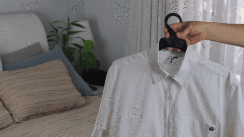 ハンガーを折り畳んだ状態で、衣類の首元からハンガー入れて、両手でカチッと音がするまで広げます。下からハンガー入れる手間が省けます。