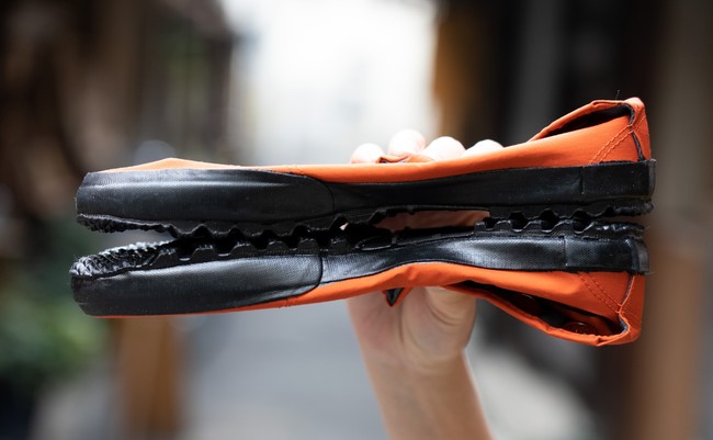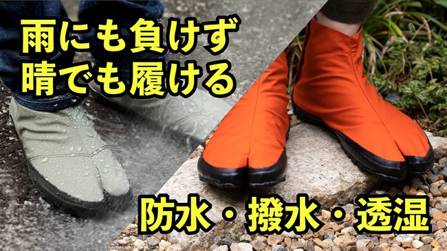 表地には防水性・撥水性を備えた生地、裏地には東レが開発したリサイクルナイロン糸で織られ、耐摩耗性に優れた生地を採用。そこに、地下足袋の「滑りにくく踏ん張りが効く」「コンパクトに持ち運べる」という特性を融合させることで、「いつでもどこでも履ける」シューズを実現しました。
