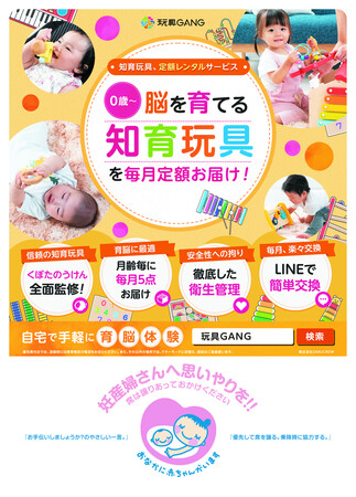 『玩具GANG』では知育玩具のレンタルを通して、0~3歳のお子様を育てる親御様の負担を減らす取り組みを行っております。0ヶ月からサービスをご利用いただけるため、妊産婦さんを末永くサポートできるよう願いをこめて、広告を掲出いたします。