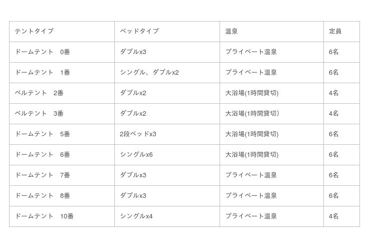 当施設の客室数は、プライベート温泉付ドームテントが3室加わり、合計9室になりました。定員やベッドタイプなど、お客様のお好みによって、お部屋をお選びいただけます。