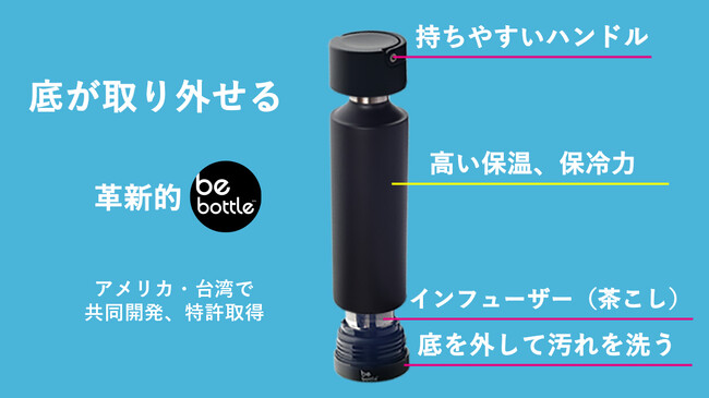 「保温保冷可能な、底を外して洗える」「Be Bottle」の開発に成功しました。