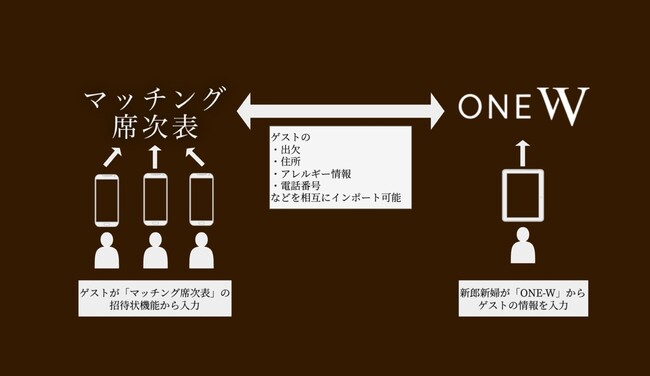 連携によって、マッチング席次表に、ONE-Wで入力したゲスト情報を簡単に取り込めるようになりました。また、ONE-Wに、マッチング席次表の招待状機能を使ってゲストが入力した情報を取り込むことが可能になりました。